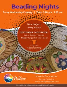Please join us for a fun learning experience with facilitator Lauren Thomas – Racette who will be teaching us flat stich beadwork. We will be making mini orange t-shirt pins and much more!
